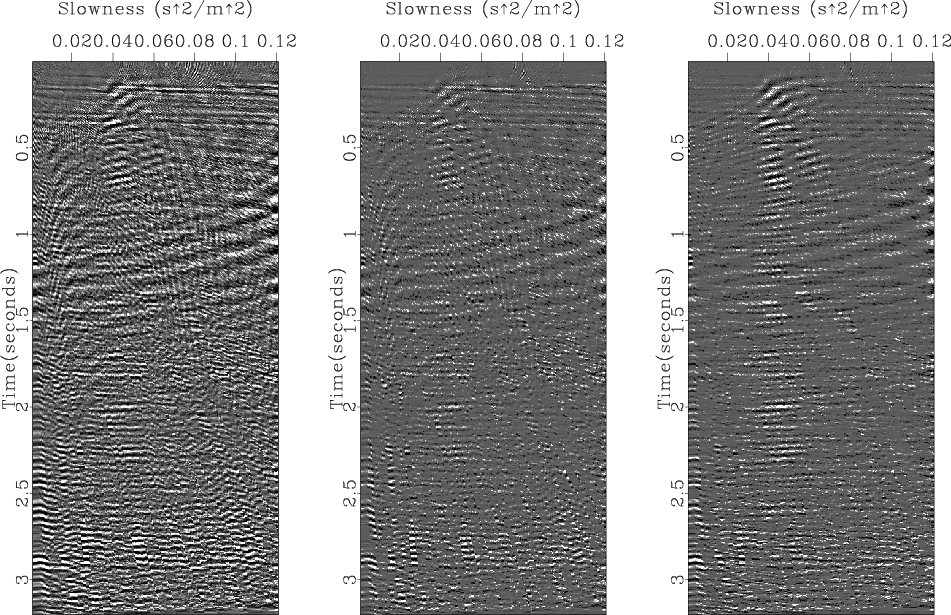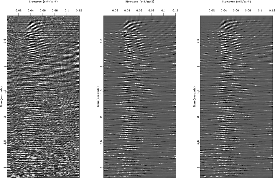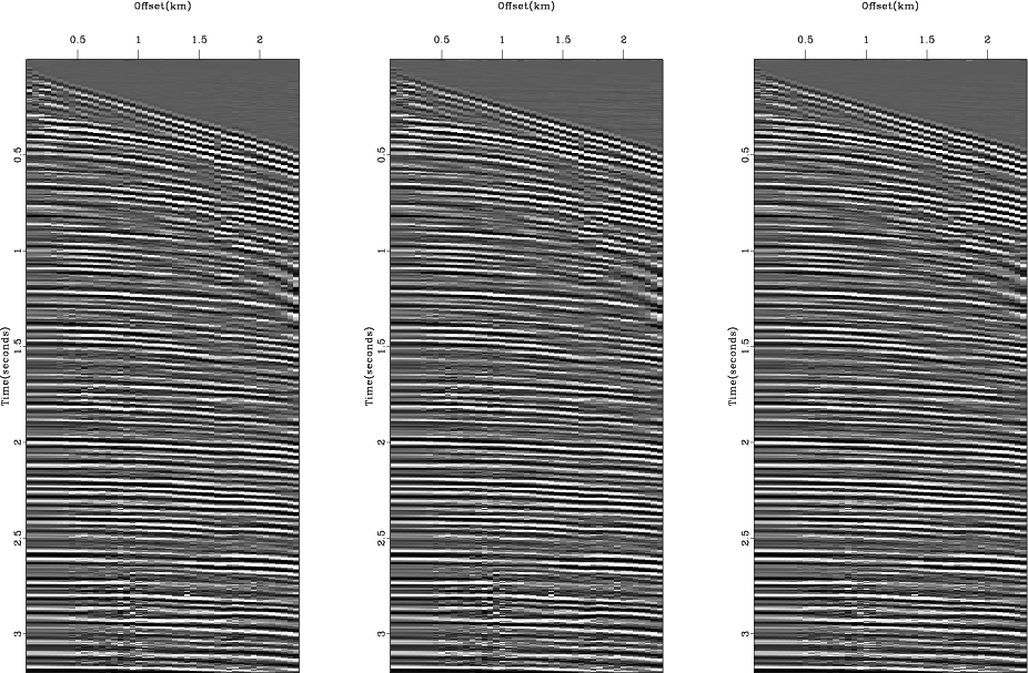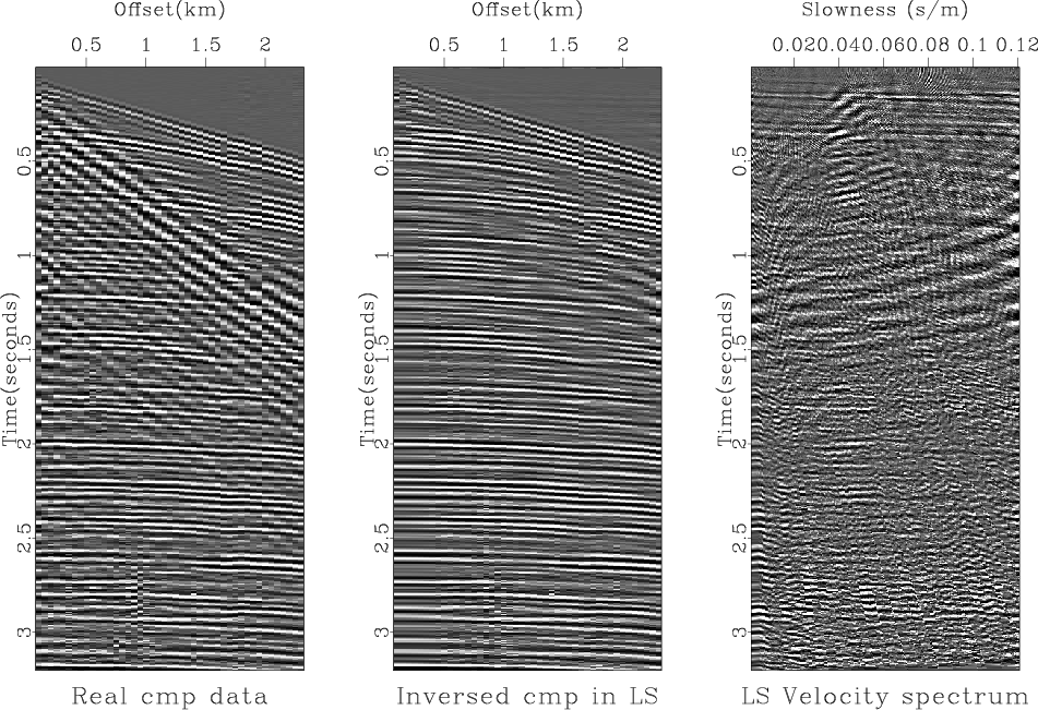 Figure 6 shows the real data set used for testing and the results, the velocity-stack (Figure 6c) and the remodeled data (Figure 6b) from it, when we used the conventional LS inversion. We can see that the real data (Figure 6a) originally contains various types of noise such as the strong ground roll, the amplitude anomalies early at near-offset and late at 0.8km offset, and the time shifts around offsets 1.6 km and 2.0 km. The conventional LS inversion generally does a good job in removing most dominant noises except some whose characteristics are somehow busty (i.e. the amplitude anomalies early at near-offset and late at 0.8km offset and the time shift around offsets 1.6 km and 2.0 km). The resultant velocity-stack panel (Figure 6c) was filled with various noises that requires some more processing if we want to perform any velocity-stack oriented processing such as velocity picking, multiple removal, and so on.