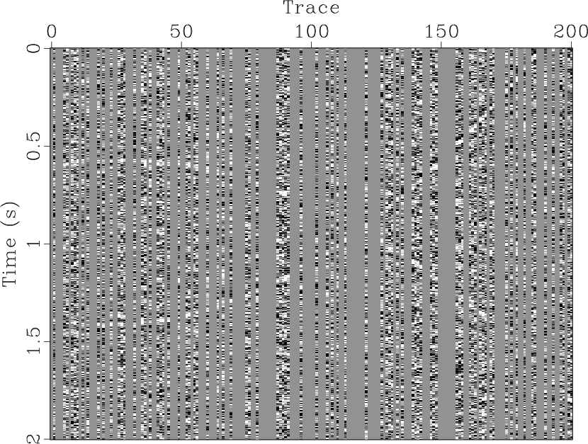 Figure 21. Synthetic model with random noise (a), model with 40% of the data traces randomly removed (b). |