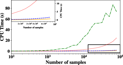 Figure 3. The CPU time comparison among the time-frequency analysis methods. Orange line: STFT; blue dash line: SLTFT; red dot line: streaming attributes; green dash-dot line: LTF decomposition. The convergence speed affects the CPU time of the LTF decomposition, resulting in a non-smooth curve. |