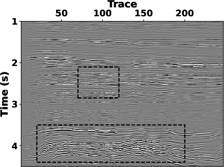 Figure 12. Enhanced seismic sections by using (a) S-transform, (b) LTF decomposition and (c) SLTFT ( ![]() |