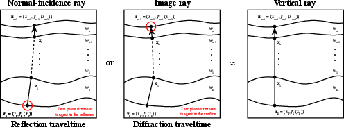 Figure 1. The ray configuration as the basis for computing the traveltime derivatives. We use the vertical ray in a 1-D anisotropic medium at the location as the reference for the normal-incidence ray and the image ray in the cases of reflection and diffraction traveltimes, respectively.
