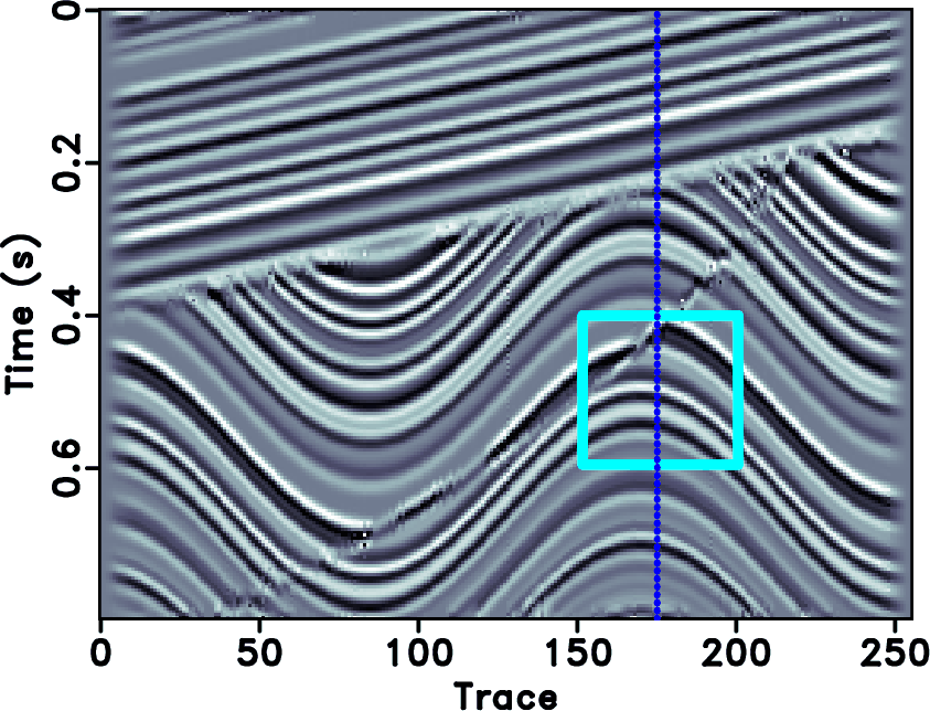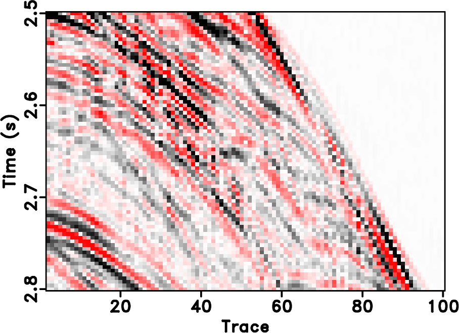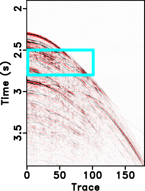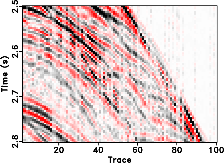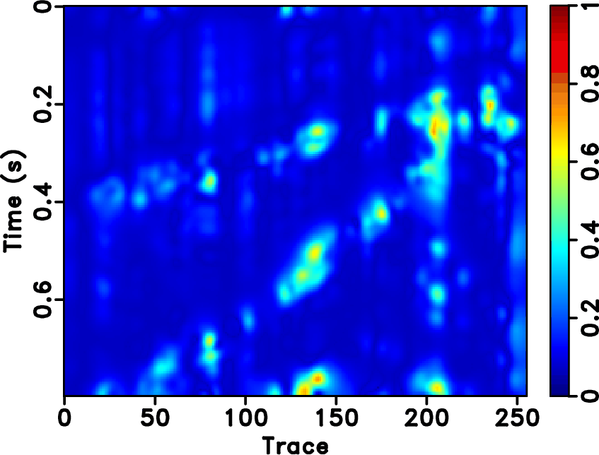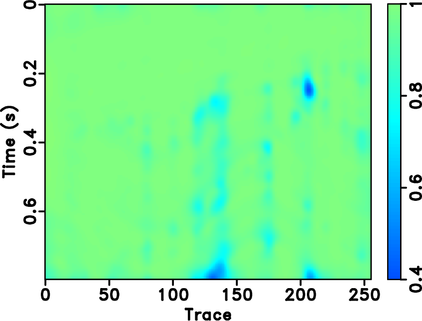Figure 15. Field data example. Local similarity between the reconstructed sections with the true data using different approaches. (a) ![]() ![]() ![]() ![]() |