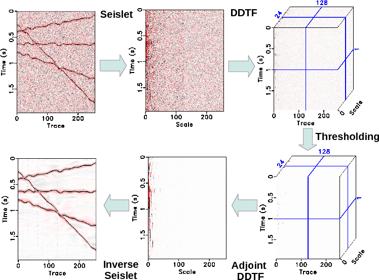 are finally used to transform the seislet subband data into the double-sparsity domain and used for the adjoint DDTF step in step 4. Figure 1 shows a demonstration of denoising processes of the proposed DSD. It also shows the seislet transform domain and DSD transform domain before and after thresholding.