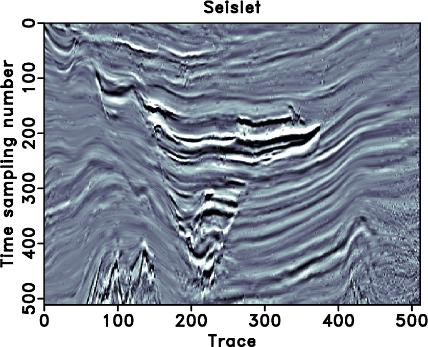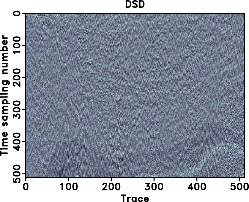 patch size for the tight frames and run 30 iterations for updating the tight frames and the coefficients. The corresponding three noise sections are shown in Figure 13. From the comparison of denoised results, we conclude that, while all of the three methods can obtain acceptable results, the proposed DSD-based thresholding produces the cleanest image (Figure 12c) with the least amount of useful energy left in the noise section (Figure 13c). The seislet transform based thresholding causes some damage to signal events around time sample 300. The DDTF based thresholding leaves some residual random noise, which comes from the fact that DDTF might automatically learn the behavior of random noise and thus become sensitive to random noise. In this example, we carefully selected parameters for each method in order to obtain the best performance. Specifically, we use 4 % coefficients in the seislet domain, 8 % coefficients in the DDTF domain, and 3 % coefficients in the DSD domain. The comparison of SNRs is shown in the third row in Table 2. The SNR comparison confirms the previous observation that DSD-based thresholding can obtain the highest SNR.