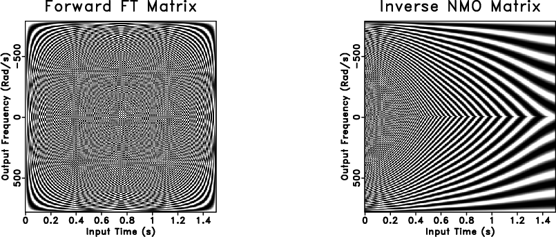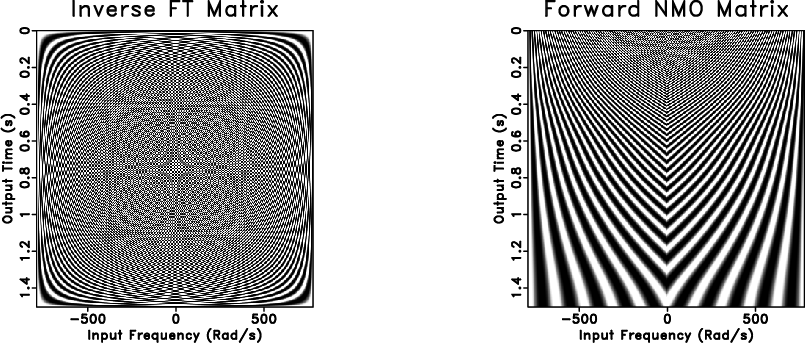 One can also decompose the forward NMO transform operator as the Hadamard product of the inverse Fourier transform matrix and the NMO shifting matrix following 18 (see Figure 3). The frequency axis of the shifting operator must exactly match the frequency axis used for the forward Fourier transform, since it will simultaneously remove that Fourier transform as it NMO-corrects the data. The inverse NMO transform can also be implemented by matrix-vector multiplication by substituting