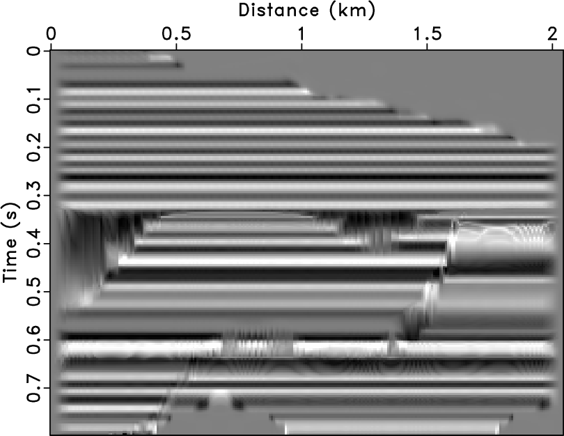 Figure 5. (a) The RT volume obtained by the predictive painting and the reference trace is the 150th trace. (b) Time warping of (a). (c) RT volume obtained by equation 10. (d) The RT volume obtained by the predictive painting and the reference trace is the 50th trace. |