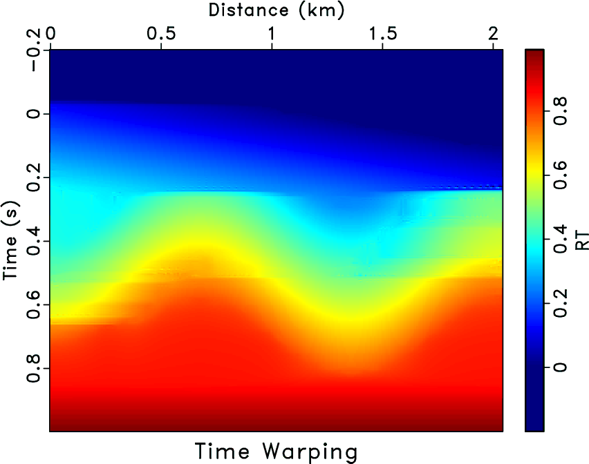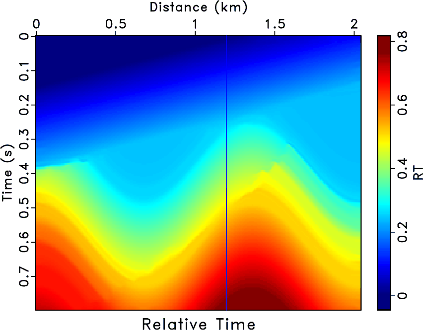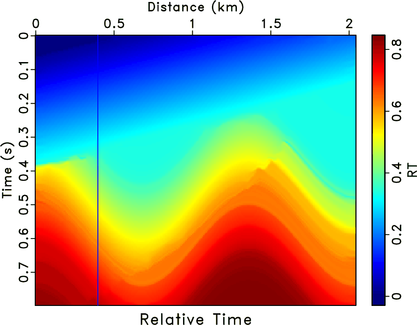 In computing an RT volume, we need to first choose one or multiple reference traces. After computing the RT volume, the RT attribute between any two traces is easily obtained from one RT volume using: