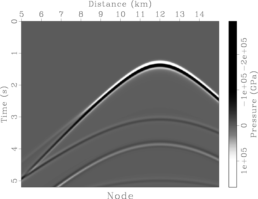 Figure 6. Response of seafloor pressure sensor at 1.875 km depth, to 400 shots spaced 25 m apart at 6 m depth, source is isotropic point radiator, source pulse is Gaussian derivative with peak frequency 5 Hz, |