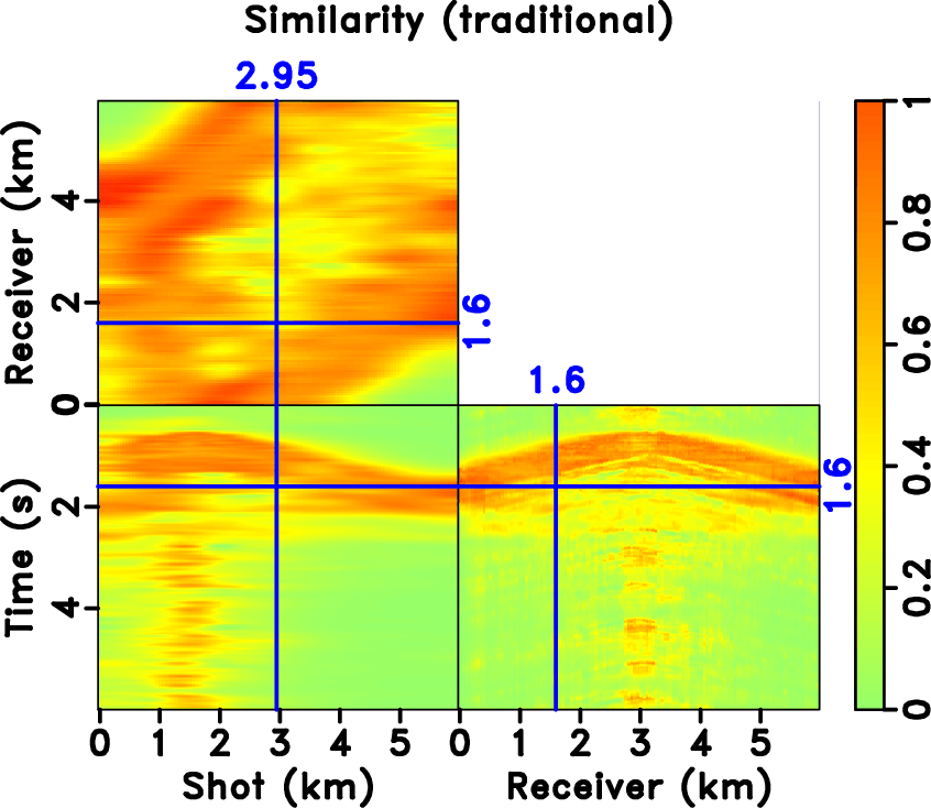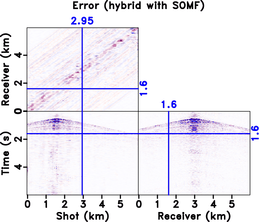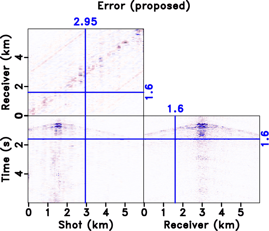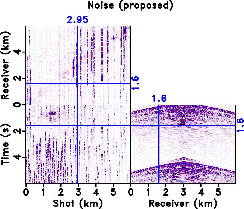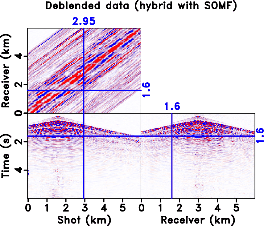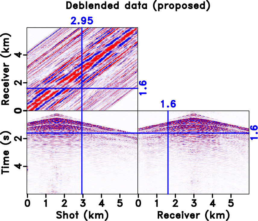 in equation 7). It is clear that the blending noise appears to be spatially incoherent in the common receiver domain (along the shot axis) and spatially coherent in the common shot domain (along the receiver axis). Figure 20a shows iteratively deblended data using the rank-constrained shaping regularization framework (Chen et al., 2014; Zu et al., 2017c). The iterative deblending is carried out in each common receiver gather based on the coherency difference between useful signals and interfering noise. For the rank-constrained inversion, we use local windows with the size of