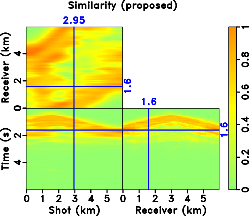 The next example is a field data test. Figure 14a shows the a common receiver gather that contains blending noise. The data is a benchmark testing data shared by BGP, China. Figure 14b shows the local slope map calculated from the raw data using the plane-wave destruction algorithm. The deblended results using four methods are shown in Figure 15. The removed blending noise corresponding to the four methods are shown in Figure 16. Combining Figures 15 and 16, it is easy to conclude that both median filter and space-varying median filter methods cause a large amount of damaged energy, the structure-oriented median filter method causes relatively less damaged energy around the large-offset areas, and the structure-oriented space-varying median filter method causes negligible damaged energy. Note that the signal damages are highlighted by the white arrows in Figure 16. In this example, the exact solution is unknown, thus we cannot use the quantitative metric that is used previously to compare the performance quantitatively. But we use the local similarity to measure the signal damage. The local similarity between the denoised (deblended) and removed noise sections are calculated to detect the signal damage for a denoising (deblending) algorithm, as proposed in Chen and Fomel (2015). High anomalies in the local similarity map indicates a more servere signal damage. The most distinct advantage of the local similarity measure is that it can measure the signal damage in a local and vivid way. Figure 17 show the four local similarity maps for the four methods. The comparison of local similarity shows vividly that all median filter, space-varying median filter, and structure-oriented median filter methods cause a large amount of damaged signals in the noise and the signal damage using the structure-oriented space-varying median filter method is the least. It is worth mentioning that some shallow reflections are not well predicted. This is likely because of the curvature of the events and the linearity of the process.