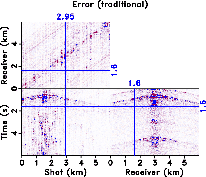 . We obtain the result shown in Figure 20a with 40 iterations. Comparing the rank-constrained deblended data with the blended data, it is clear that most blending noise is removed. However, there is still much residual noise. By cascading the structure-oriented space-varying median filter and the rank filter based on the iterative shaping regularization framework, as expressed by equations 8, we obtain a much improved deblended result, as shown in Figure 20b. During the inversion, we linearly decrease the filter length from 11 points to 0. A comparison between the two deblended data in Figure 20 confirms the effectiveness of the structure-oriented space-varying median filter method in improving iterative deblending. Figure 21 shows the deblending error for the traditional method and the proposed method. The deblending error means the difference between the unblended data (exact solution) and the deblended data. From Figure 21, it is obvious that the deblending error for the proposed method is negligible while the error for the rank-reduction method is very large. Figure 22 shows the removed noise corresponding to the two methods, note that the interfering shots are coherent in the second spatial dimension.. For evaluating the signal damages of this example, we calculate the local similarity between the deblended data and the noise and show them in Figure 23, where much larger local similarity anomalies are shown in the similarity map corresponding the traditional method. To compare the amplitude preservation in detail, we plot a trace-by-trace comparison in Figure 24a. The black line is from the unblended data. The red line is from the blended data. The magenta line corresponds to the rank-constrained method. The green line corresponds to the proposed method. It is salient that the black and green lines are very close to each other, thus the deblending error using the proposed approach is much less than the traditional method for most parts. In order to compare the hybrid method with the structure-oriented space-varying median filter and the hybrid with the structure-oriented median filter, we also have a inversion test using the structure-oriented median filter. The deblended data is shown in Figure 25. It is obvious that the hybrid method with the structure-oriented median filter causes much higher deblending error.