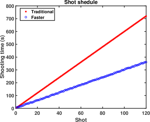Figure 18. (a) Acquisition geometry. The red dots denote shot locations and blue inverted triangles denote receivers. The simultaneous shooting and the traditional shooting only differ in the shot schedule. (b) Shot schedule. Note that the shot schedule is just for testing purpose and does not represent a real field deployment. In the test, the speed of a shooting vessel is assumed to be sufficiently large. In practice, the shot sampling would be much higher than the testing case, which is 0.05 km. |