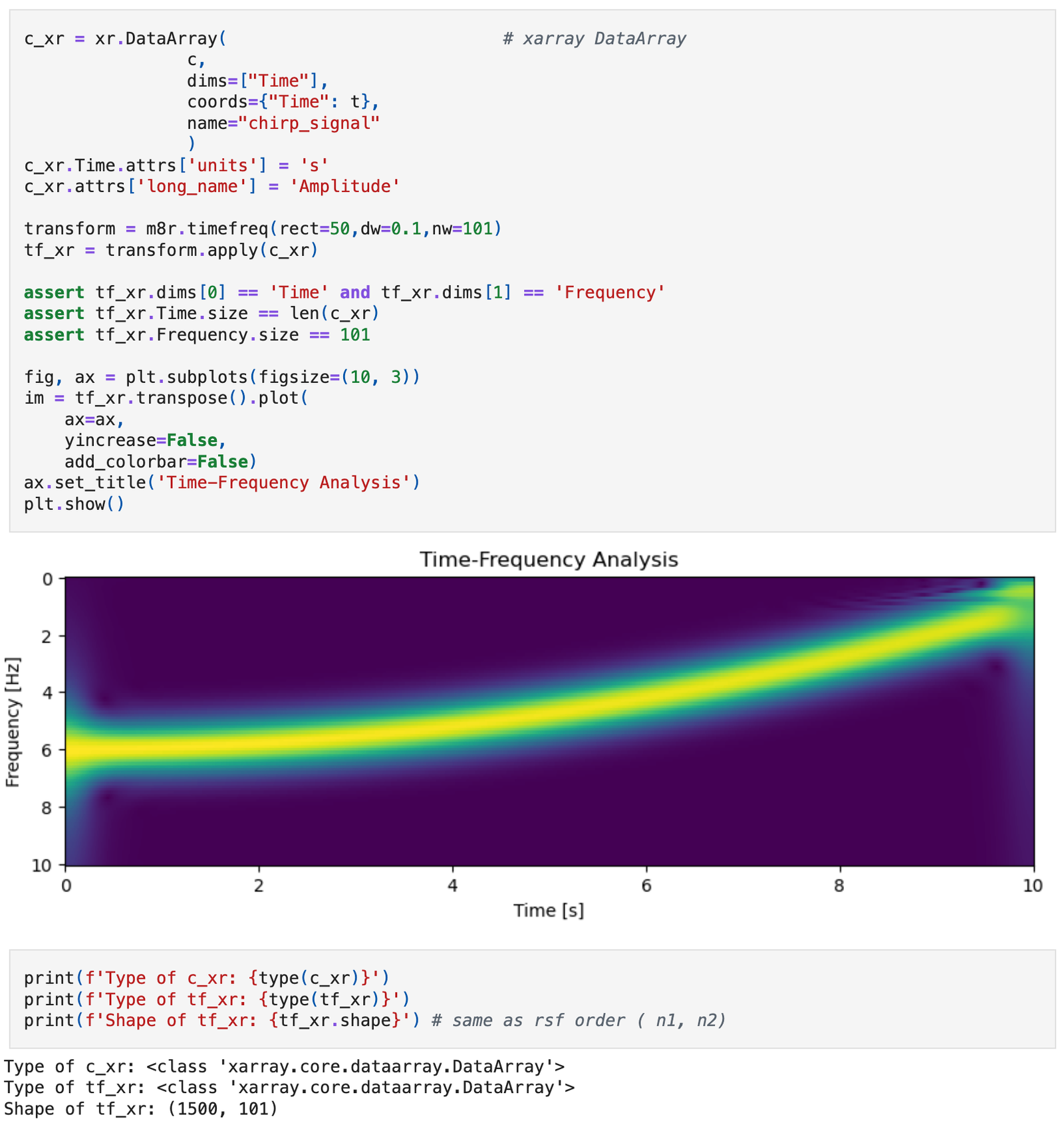 Why Xarray? While the NumPy interface is useful, Xarray offers a major advantage. It preserves metadata (coordinates, dimensions, and units) alongside the data. This allows the interface to automatically handle RSF header attributes. See an example