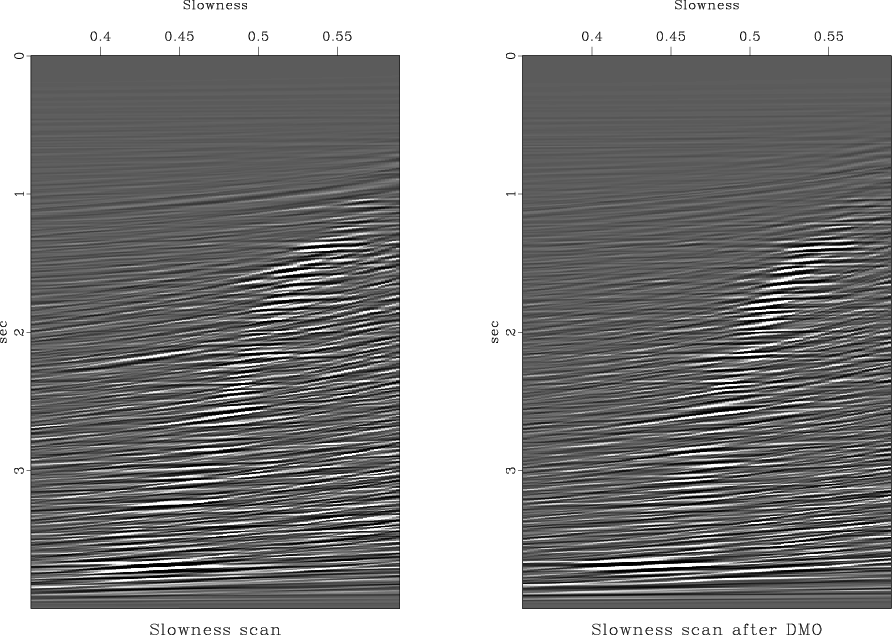 Figure 15. Velocity analysis panel of one of the panels in Figure 8.14 before (left) and after (right) DMO. Before DMO, at 2.2 sec you can notice two values of slowness, the main branch at .5 sec/km, and another at .4 sec/km. The faster velocity |
