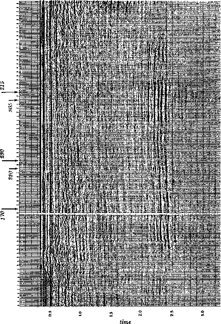 Figure 5. Midpoint gather 220 (same as timing of (h,y) in Figure 9.4b) after moveout. Shown is a one-second window centered at 2.3 seconds, time shifted according to an NMO for an event at 2.3 seconds, using a velocity of 7000 feet/sec. (Kjartansson) |
