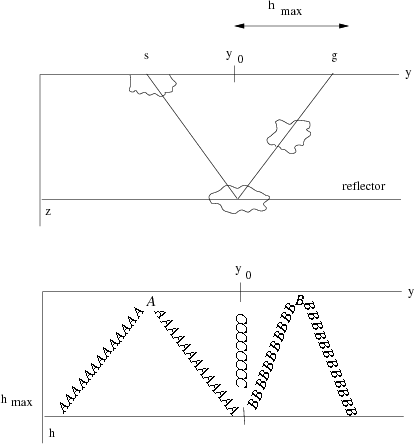 Figure 2. Kjartansson's model. The model on the top produces the disturbed data space sketched below it. Anomalous material in pods A, B, and C may be detected by its effect on reflections from a deeper layer. |