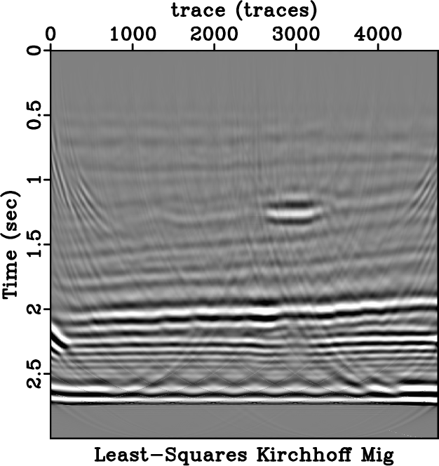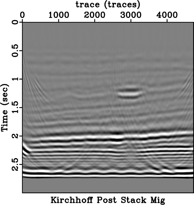 The stack and RMS velocity were input to sfkirchnew to apply post-stack Kirchhoff migration (Figure 7). Least squares Kirchhoff migration was computed using the sfkirchinvs program (Figure 8).