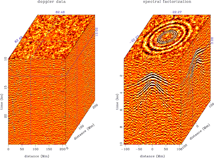 Solar physicists have learned how to measure the seismic field of the sun surface. It is chaotic. If you created an impulsive explosion on the surface of the sun, what would the response be? James Rickett and I applied the helix idea along with Kolmogoroff spectral factorization to find the impulse response of the sun. Figure 9 shows a raw data cube and the derived impulse response. The sun is huge, so the distance scale is in megameters (Mm). The United States is 5-Mm wide. Vertical motion of the sun is measured with a videocamera-like device that measures vertical motion by an optical doppler shift. From an acoustic/seismic point of view, the surface of the sun is a very noisy place. The figure shows time in kiloseconds (Ks). We see roughly 15 cycles in 5 Ks which is 1 cycle in roughly 333 seconds. Thus, the sun seems to oscillate vertically with roughly a 5-minute period. The top plane of the raw data in Figure 9 (left panel) happens to have a sun spot in the center. The data analysis here is not affected by the sun spot, so please ignore it.