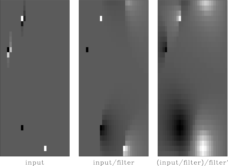 Figure 10. Deconvolution by a filter with autocorrelation being the 2-dimensional Laplacian operator. Amounts to solving the Poisson equation. Left is ![]() ![]() ![]() |