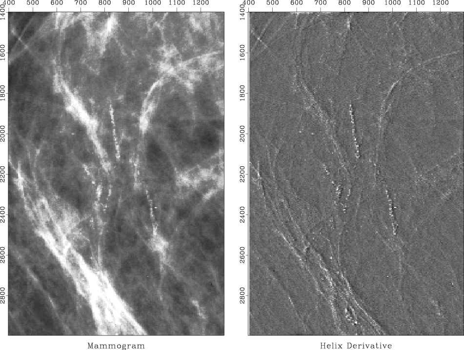 I prepared a half dozen medical X-rays like Figure 13. The doctor brought her young son to my office one evening to evaluate the results. In a dark room, I would show the original X-ray on a big screen and then suddenly switch to the helix derivative. Every time I did this, her son would exclaim ``Wow!'' The doctor was not so easily impressed, however. She was not accustomed to the unfamiliar image. Fundamentally, the helix derivative applied to her data does compress the dynamic range making weaker features more readily discernible. We were sure of this from theory and various geophysical examples. The subjective problem was her unfamiliarity with our display. I found that I could always spot anomalies more quickly on the filtered display, but then I would feel more comfortable when I would discover those same anomalies also present (though less evident) in the original data. Retrospectively, I felt the doctor would likely have been equally impressed had I used a spatial low-cut filter instead of the helix derivative. This simpler filter would have left the details of her image unchanged (above the cutoff frequency), altering only the low frequencies, thereby allowing me to increase the gain.