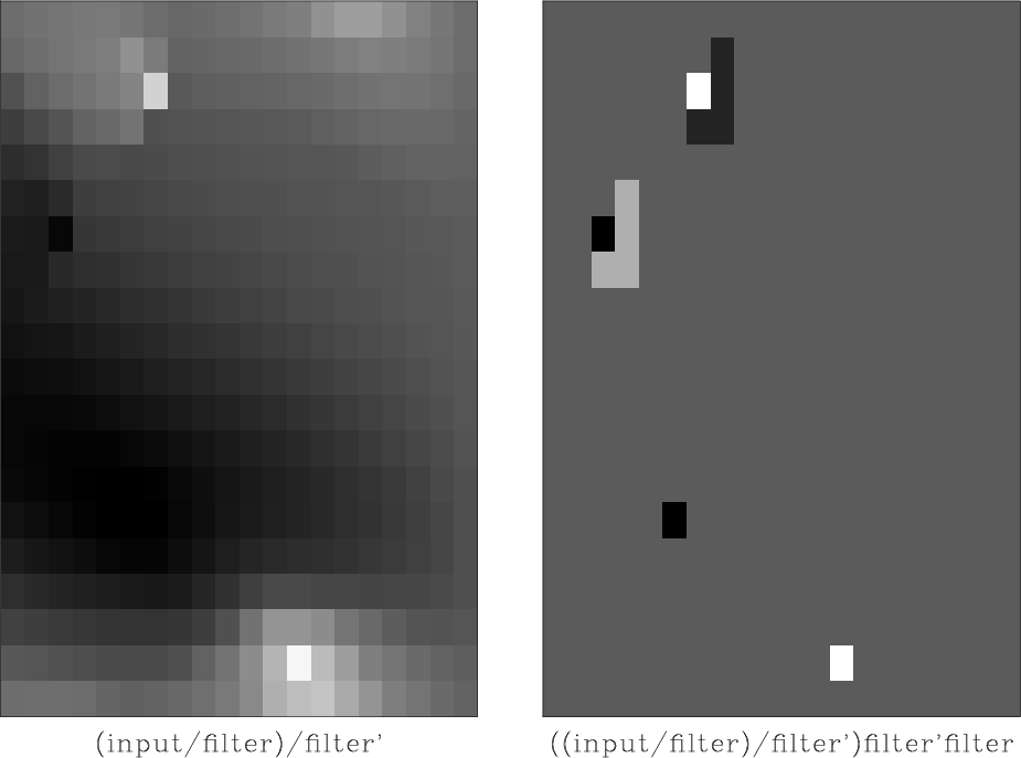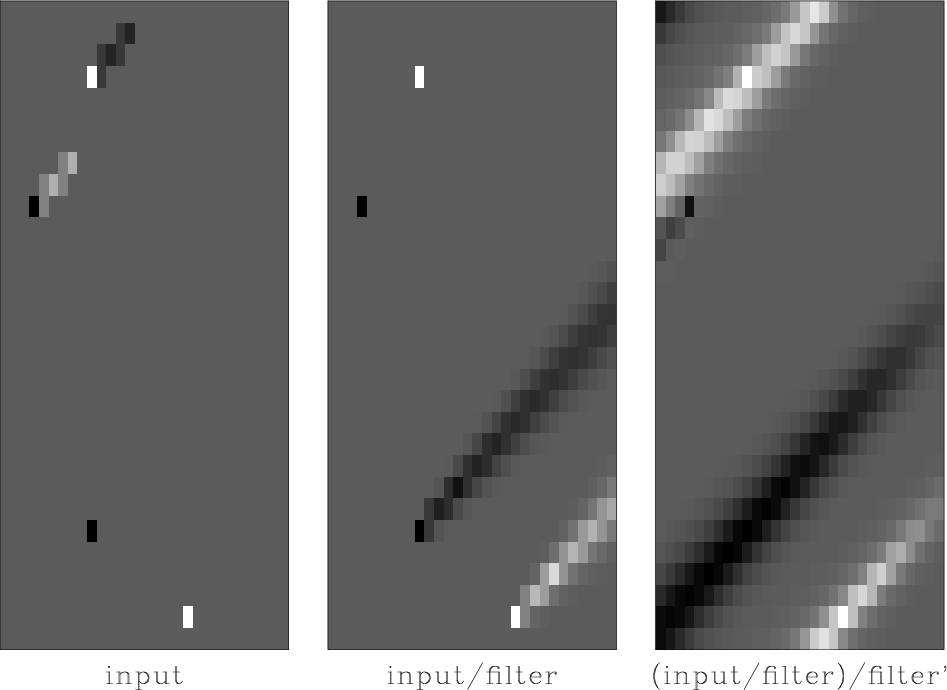 Figure 4. Recursive filtering backward (leftward on the space axis) is done by the adjoint of 2-D deconvolution. Here we see that 2-D deconvolution compounded with its adjoint is exactly inverted by 2-D convolution and its adjoint. |