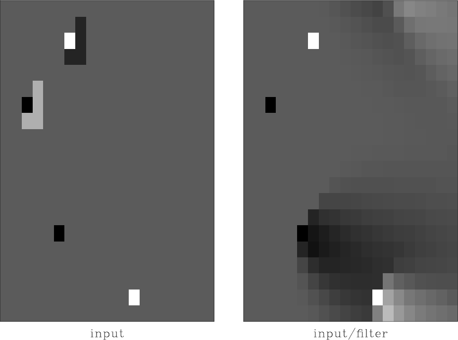 Figure 3. Illustration of 2-D deconvolution. Left is the input. Right is after deconvolution with the filter (5) as preformed by by module polydiv |