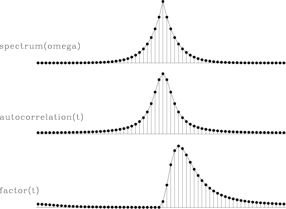 Figure 7. Autocorrelate the bottom signal to get the middle, then Fourier transform it to get the top. Spectral factorization works the other way, from top to bottom. |