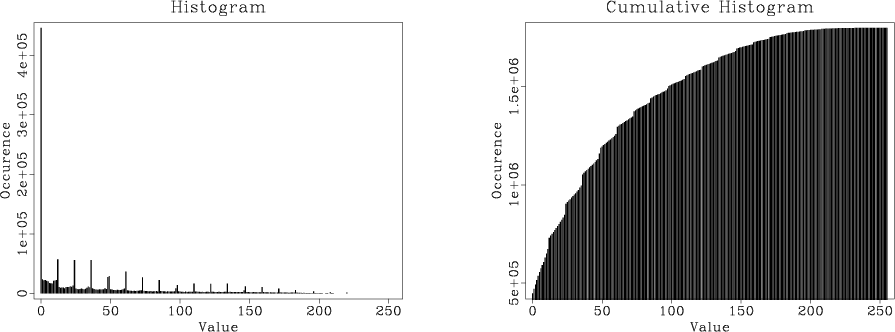 Figure 2. Histogram (left) and cumulative histogram (right) of the digital elevation data. |