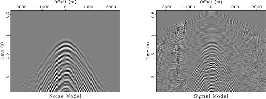Figure 3. (a) Noise model created by low-pass filtering of the original data. (b) Result of subtraction of the noise model from the data. |