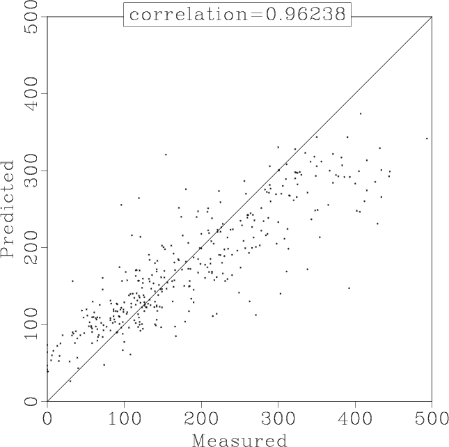 Figure 10. Correlation between interpolated and true data values for preconditioning with 100 iterations. |