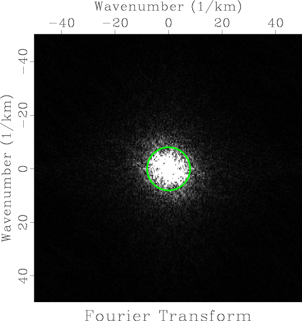 Figure 2. Absolute value of the Fourier transform of the seismic slice from Figure 1. The circle inside shows a window selected for compression. |