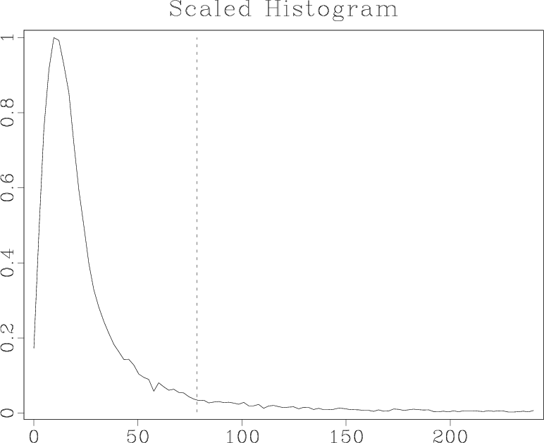 Figure 5. Normalized histogram of Fourier coefficients (by absolute value). The vertical line shows the selected threshold. |