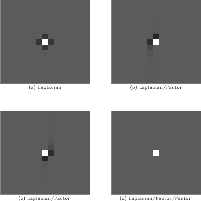 Figure 9. Impulse response of the five-point Laplacian filter (a) gets inverted by recursive filtering (polynomial division) on a helix. (b) Division by ![]() ![]() ![]() |