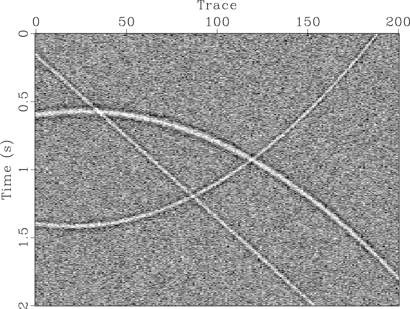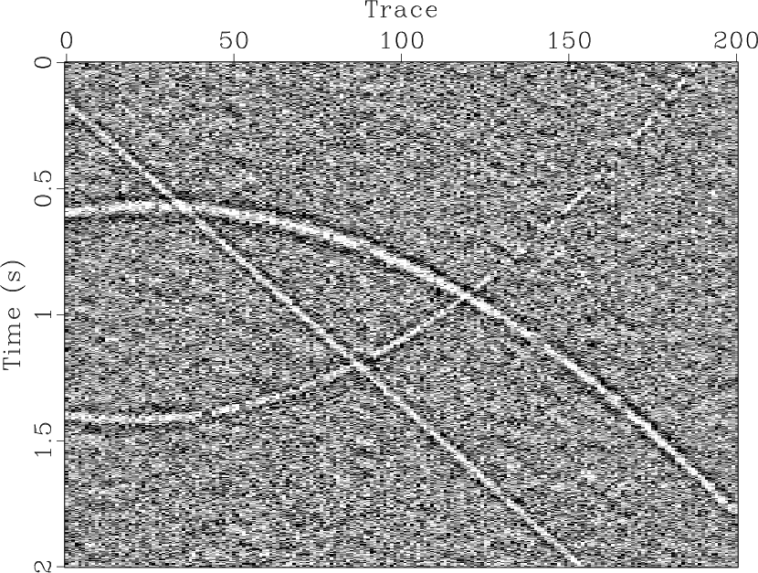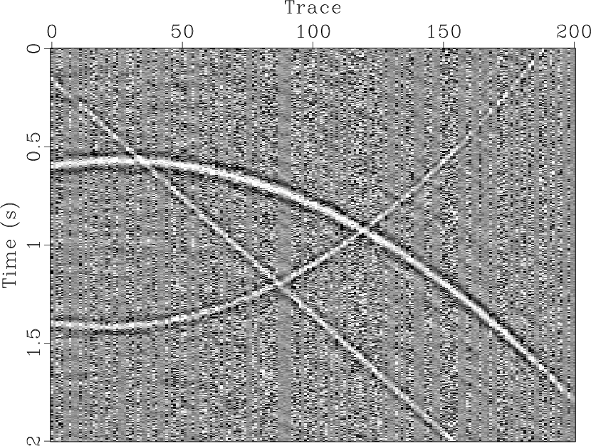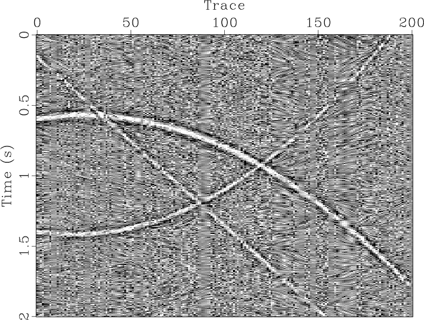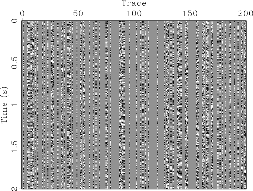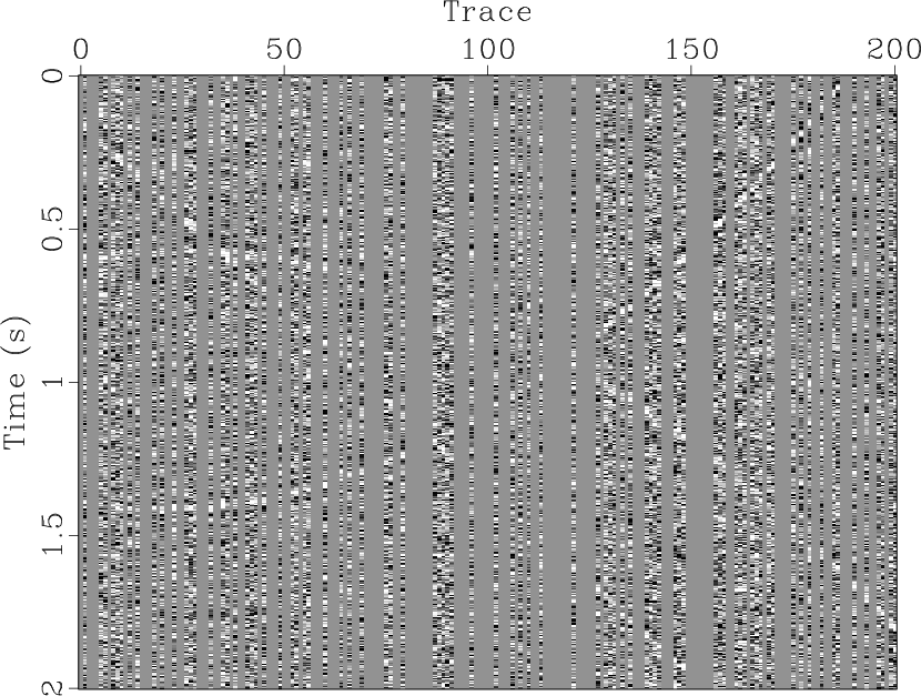 Figure 21. Synthetic model with random noise (a), model with 40% of the data traces randomly removed (b). |