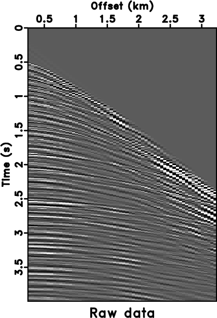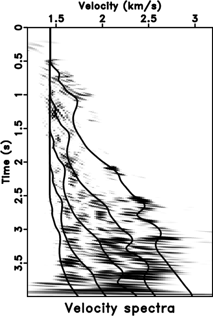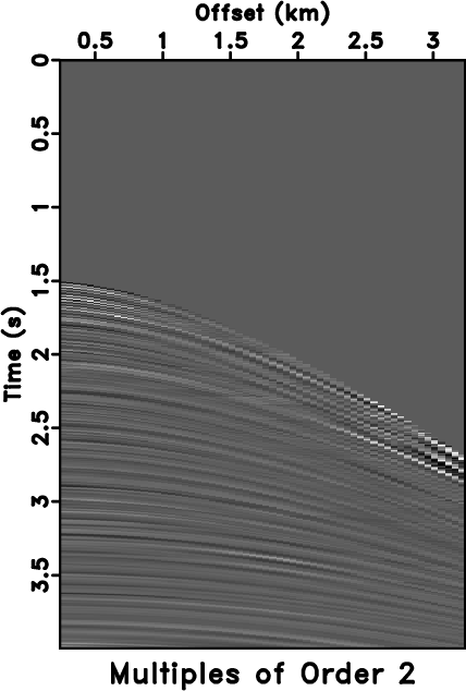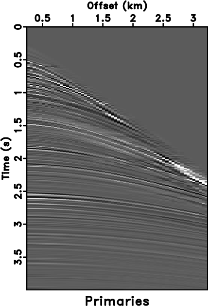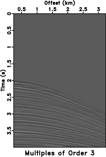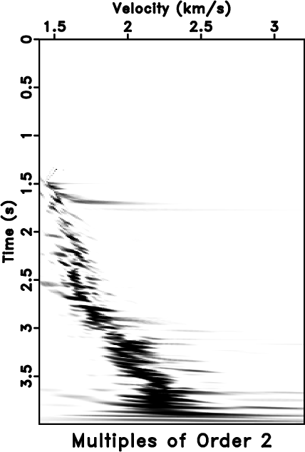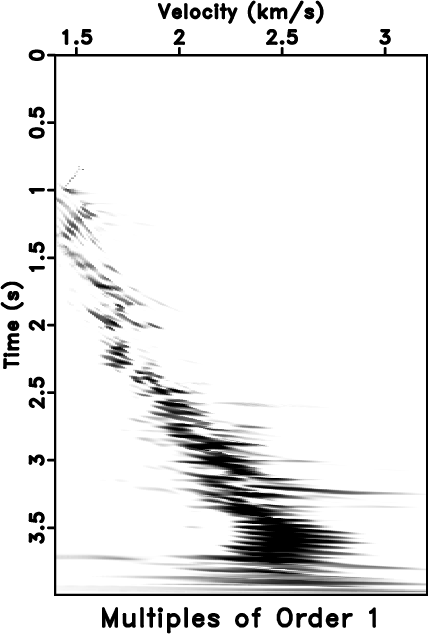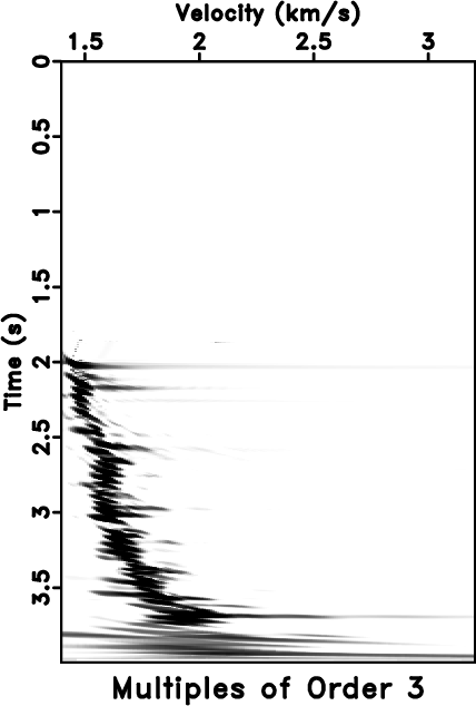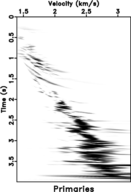 Next, we test the proposed algorithm to separate multi-wavefields on a single CMP gather from the Viking Graben (Mobil AVO) dataset (Keys and Foster, 1998). The field data are shown in Figure 10a. We pick the primary velocities by muting spectra energy of multiples. Multiple RMS velocities with different orders (equation 9) follow the pseudo-primary NMO equation 8. The velocity spectra of primaries and multiples are shown in Figure 10b. Equations 7 and 10 convert velocities to slopes, which help the VD-seislet frame separate primaries from different-order pegleg multiples (we only display three orders). Figure 11 displays the separated primaries and different-order multiples. The corresponding velocity spectra are shown in Figure 12. After separating different wavefields, the velocity spectra confirm that the signals get concentrated around their respective trends.