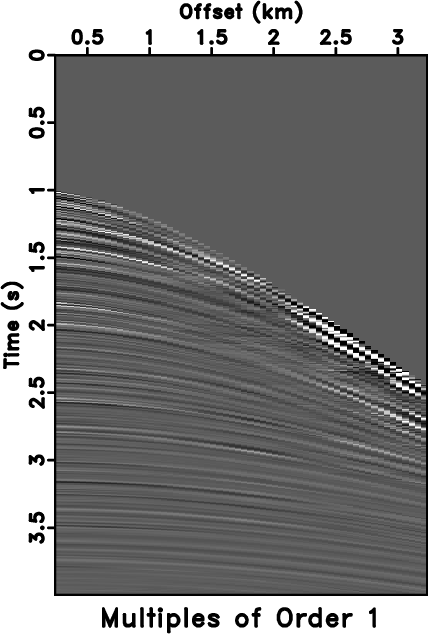 Figure 11. Separated wavefields. Primaries (a), first-order multiples (b), second-order multiples (c), and third-order multiples (d). |