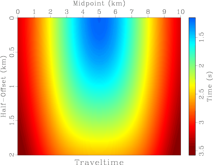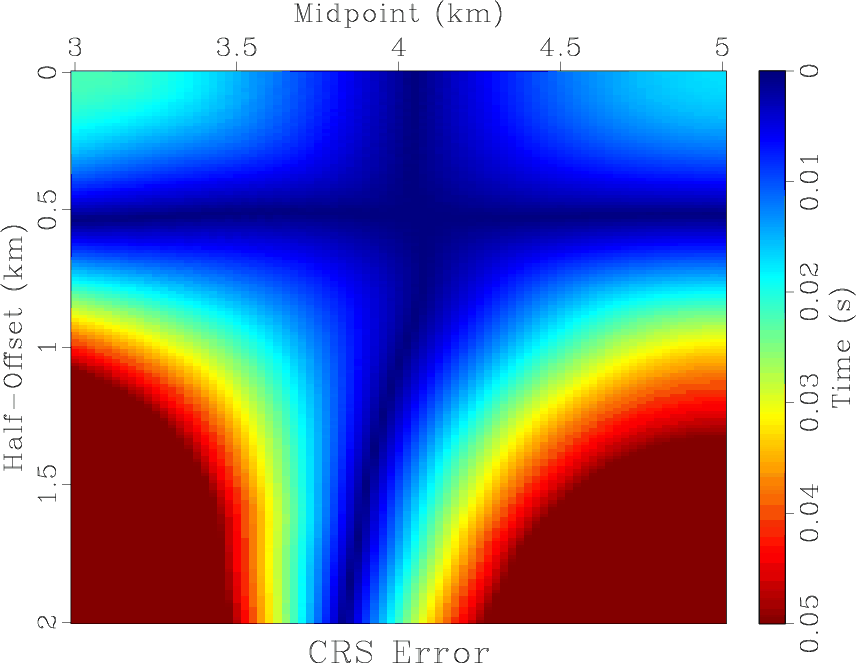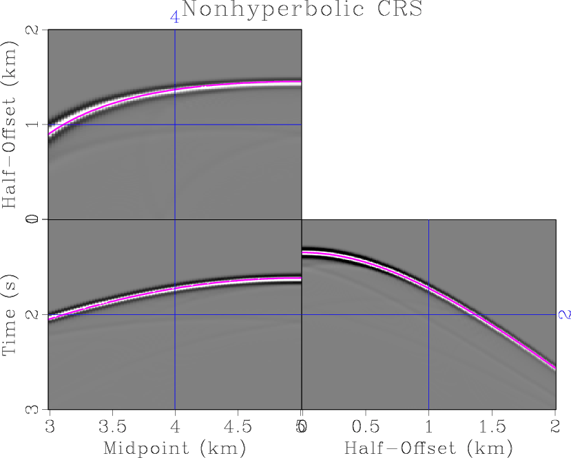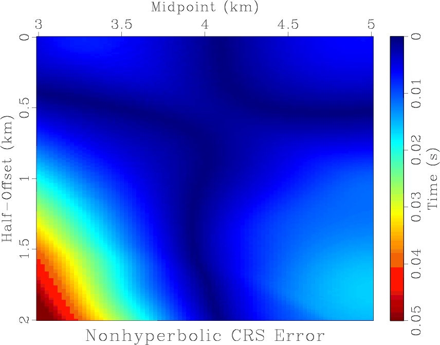 The absolute error of CRS and nonhyperbolic CRS approximations, for a range of offsets and midpoints, is plotted in Figure 3. The nonhyperbolic CRS error is significantly smaller for a wide range of offsets and midpoints, which extends the applicability of the approximation. To effect of different approximations is shown additionally in Figure 4, which displays the modeled synthetic data with overlaid CRS and nonhyperbolic CRS approximations. The average relative error in different approximations, for the selected range of offsets and midpoints, is 1.24 % for the case of CRS and 0.41 % for the case of nonhyperbolic CRS. The average absolute error is 25 ms for the case of nonhyperbolic CRS and 8 ms for the case of nonhyperbolic CRS.