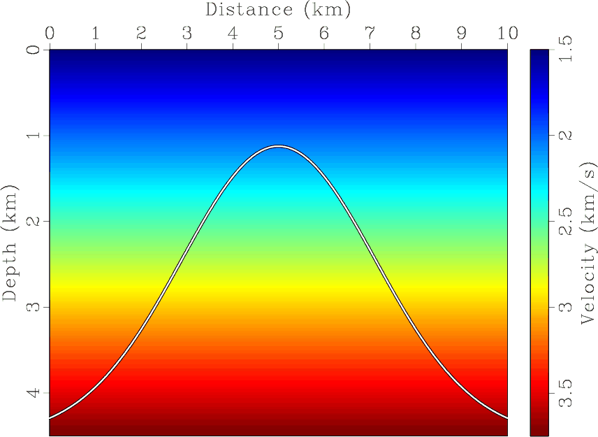 Figure 2. (a) Synthetic velocity model with a Gaussian-shape reflector. (b) Modeled reflection traveltime. |
