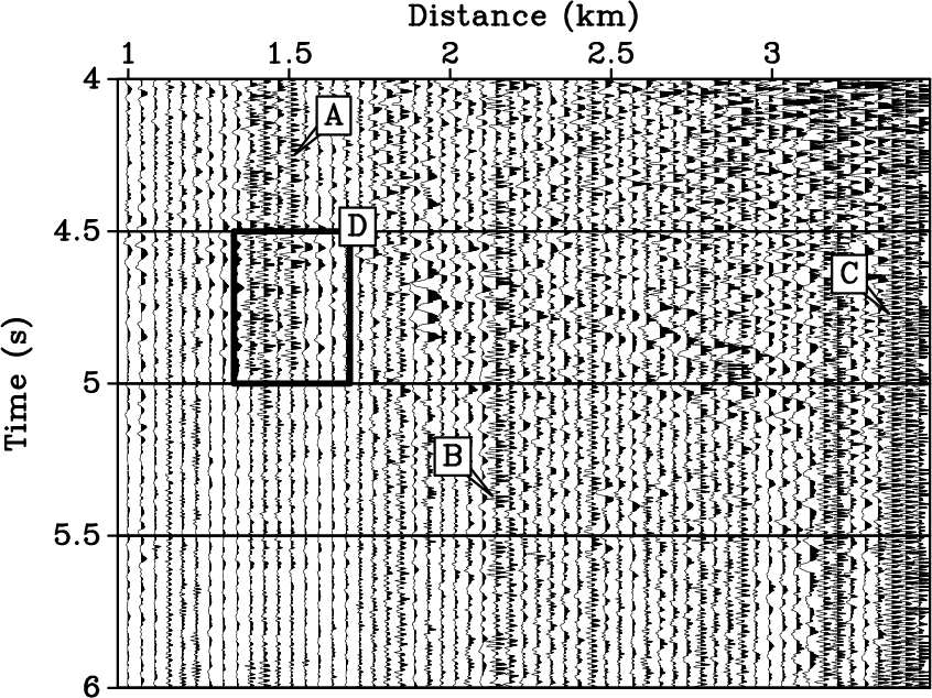 estimation using the stack method, a rectangle region ``D'' that has 9 traces and 125 samples is chosen, and, after calculating, the SNR