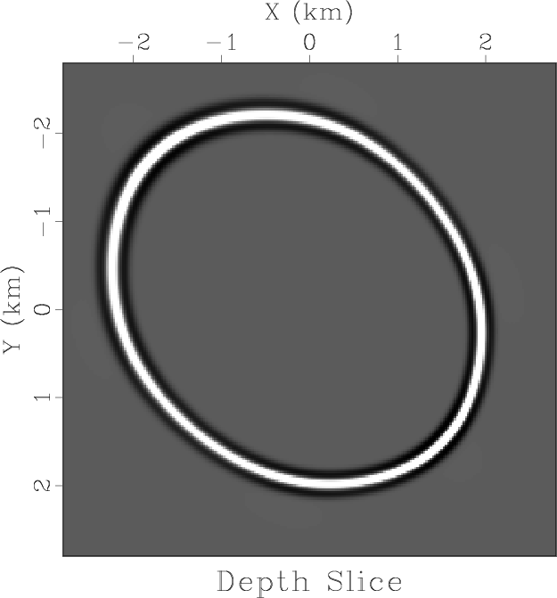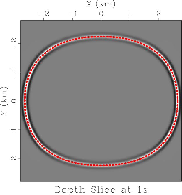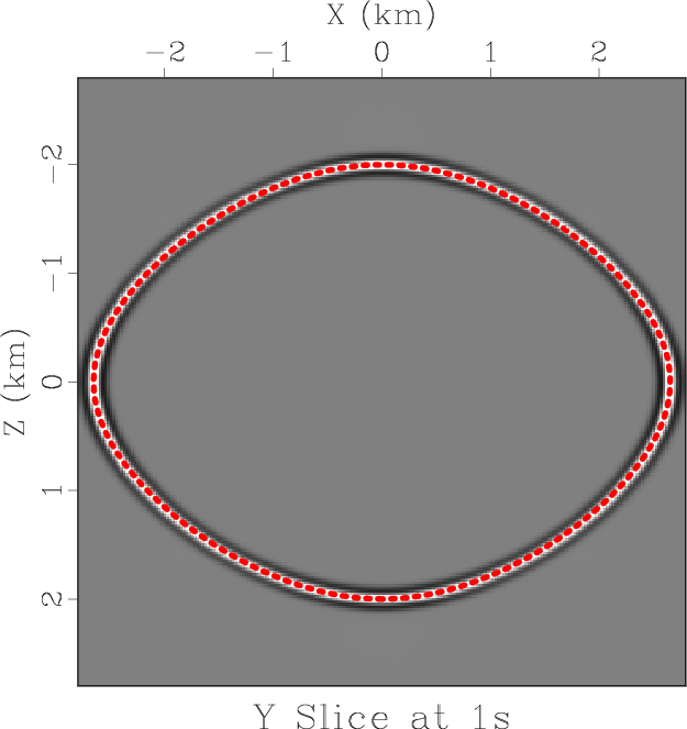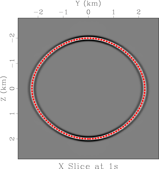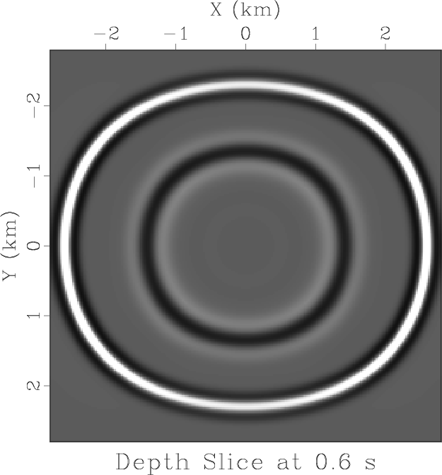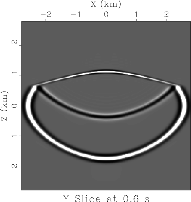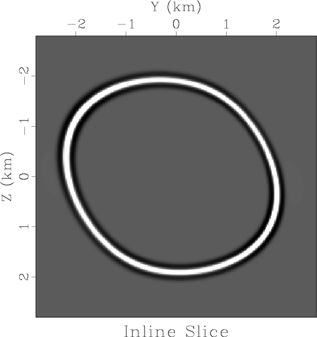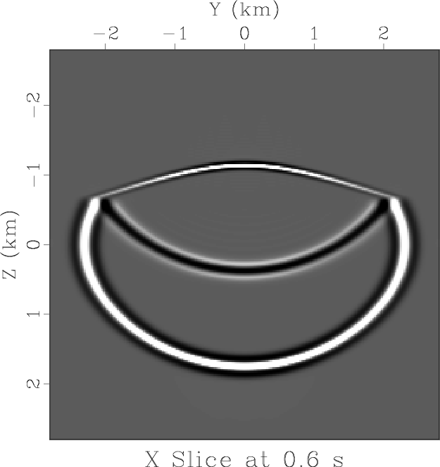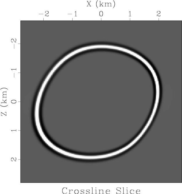Figure 6(a)-6(c) shows corresponding wavefield snapshots by the dispersion relation 12 in depth, inline, and crossline slices through the central source location.
