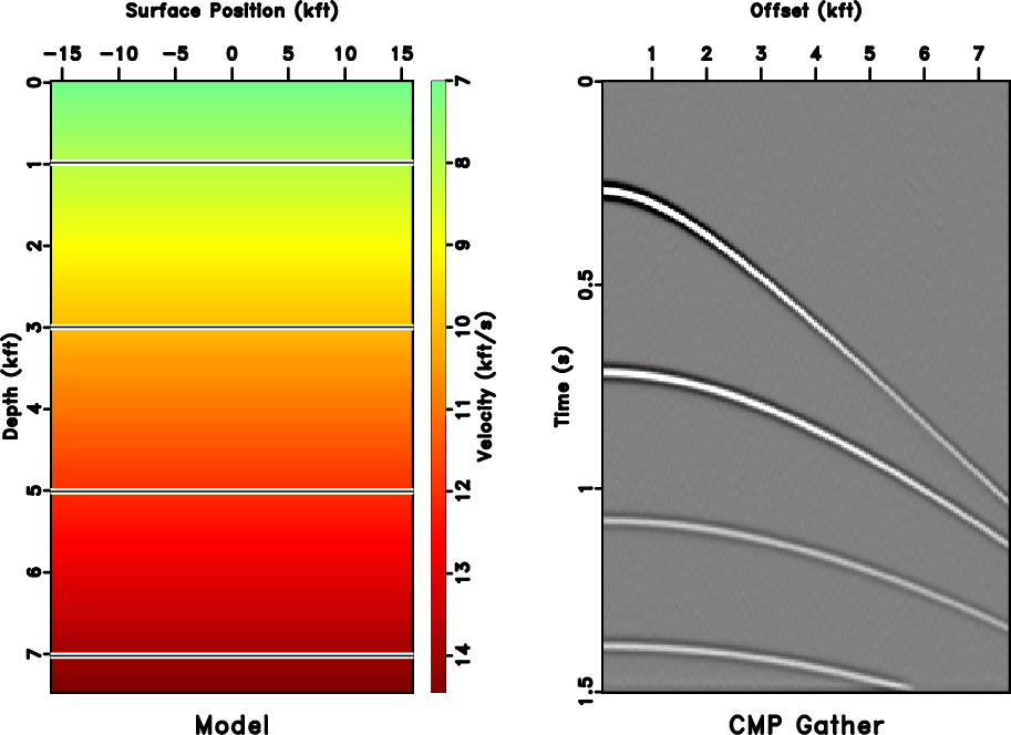 Figure 2. Synthetic CMP gather. Left: Velocity model. Four reflectors are placed in a background velocity that increases linearly with depth ( ![]() |