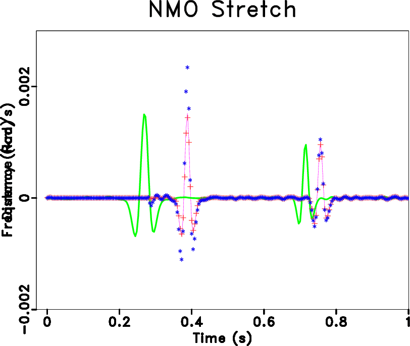 (Yilmaz, 2001). Another approach to describing NMO stretch comes from analyzing the effects of the NMO correction in terms of instantaneous frequency (Barnes, 1992). This approach provides excellent insight into the frequency distortion, and yields an exact expression for NMO stretch,