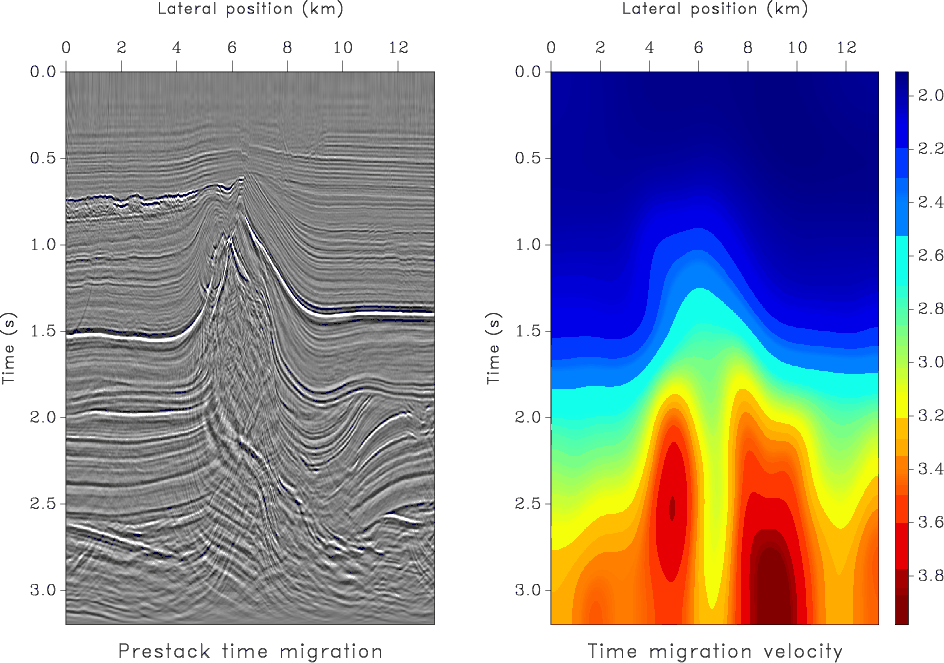 Figure 3. (a) Seismic image from North Sea obtained by prestack time migration using velocity continuation (Fomel, 2003). (b) Corresponding time-migration velocity. |