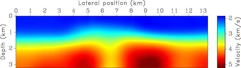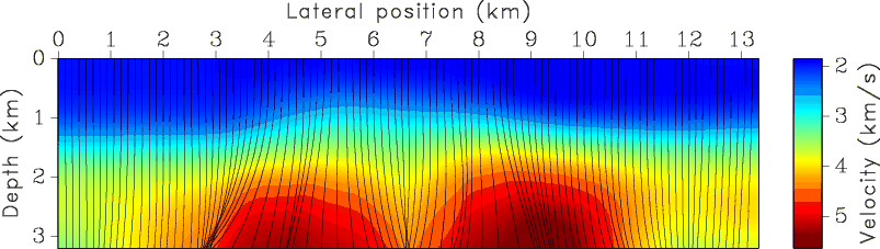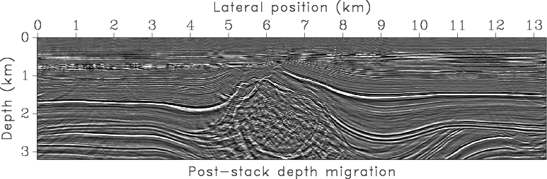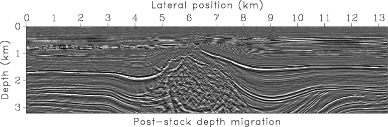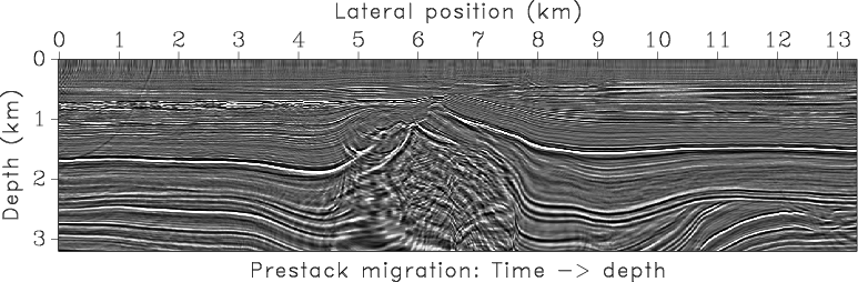 Figure 3, taken from (Fomel, 2003), shows a prestack time migrated image from the North Sea and the corresponding time-migration velocity obtained by velocity continuation. The most prominent feature in the image is a salt body which causes significant lateral variations of velocity. Figure 4 compares the Dix velocity converted to depth with the interval velocity model recovered by our method. As in the synthetic example, there is a significant difference between the two velocity caused by the geometrical spreading of image rays. The middle part of the velocity model may not be recovered properly. The true structure should include a salt body visible in the image. The inability of our method to recover it exactly shows the limitation of the proposed approach in the areas of significant lateral velocity variations, which invalidate the assumptions behind time migration (Robein, 2003). Figure 5 compares three images: post-stack depth-migration image using Dix velocity, post-stack depth-migration image using the velocity estimated by our method, and prestack time-migration image converted to depth with our algorithm. The evident structural improvements in Figure 5(b) in comparison with Figure 5(a), in particular near salt flanks, and a good structural agreement between Figures 5(b) and 5(c) serve as an indirect evidence of the algorithm success. An ultimate validation should come from prestack depth migration velocity analysis, which is significantly more expensive.