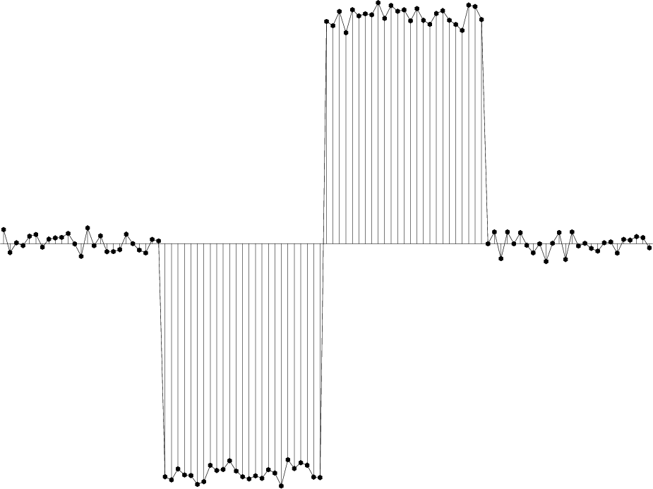 To better understand the effect of smoothing, you decide to create a one-dimensional synthetic example shown in Figure 3(a). The synthetic contains both sharp edges and random noise. The output of conventional triangle smoothing is shown in Figure 3(b). We see an effect similar to the one in the real data example: random noise gets removed by smoothing at the expense of blurring the edges. Can you do better?