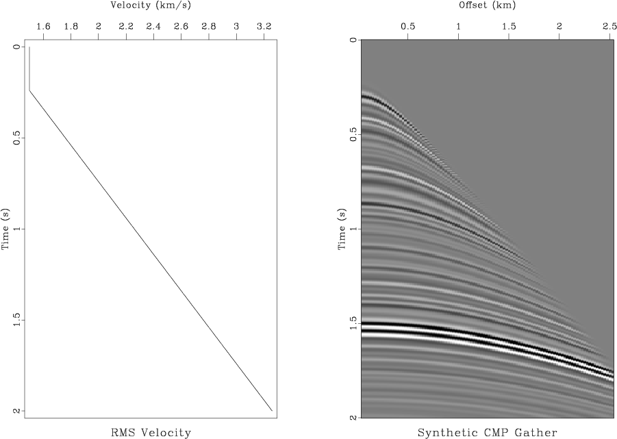 Figure 1. RMS velocity profile (left) and synthetic CMP gather (right). |