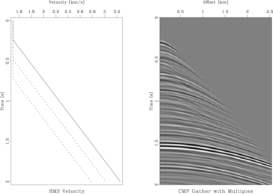 Figure 2. RMS velocity profiles for primaries and multiples (left) and synthetic multiple-infected CMP gather (right). |