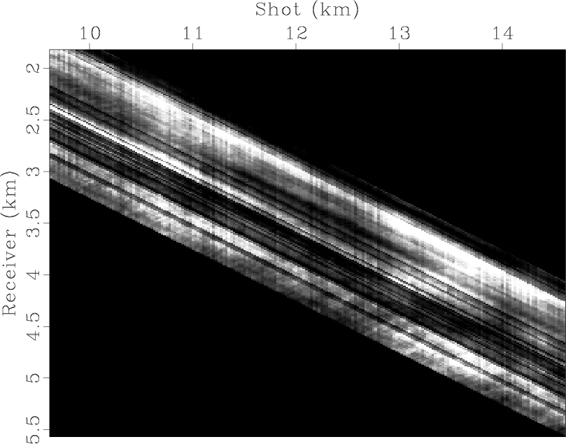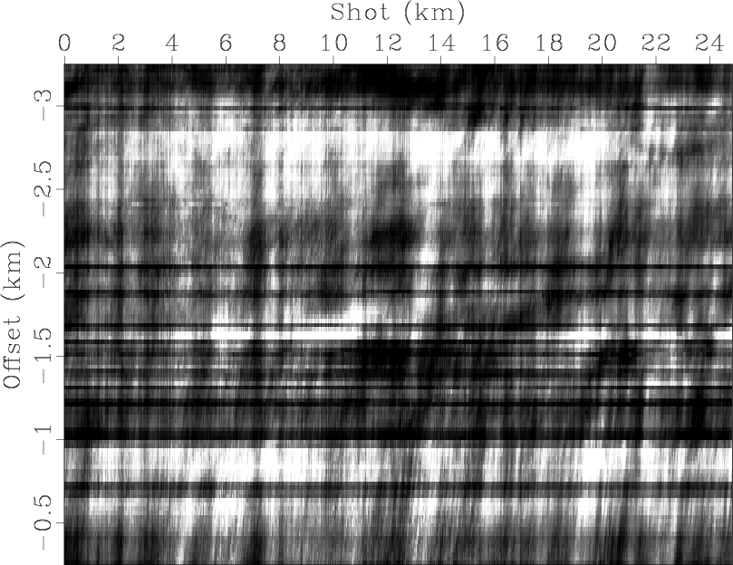 Figure 1 shows the result after normalization by the root-mean-square value of the amplitude. In this figure the horizontal stripes correspond to offsets where the hydrophone had an impulse response that was weaker (darker stripe) or stronger (brighter stripe) than the average response of the other receivers. Likewise, the vertical stripes indicate where the source had an impulse response that varied from the average. Less obvious, though noticeable, are two other categories of stripes dipping to the left. One is quite visible at the bottom of the plot around the offset -0.5 km, dipping at approximately 10 degrees. An example of the second type of stripe, which dips 20 degrees to the left, is visible at the source position 16 km. Based on the amplitude plot in Figure 1, we have built a model of offset-, source-, midpoint-, and receiver-consistent stripes (Figure 2). Comparing both figures we can identify the first category of dipping stripes as being midpoint-consistent, whereas the less steep stripes are receiver-consistent. The stripes in the receiver directions are broader than the others and therefore not as visible in the source and receiver coordinate system (Figure 3). The stripes in the offset direction follow the descending diagonal in the transformed coordinate system.