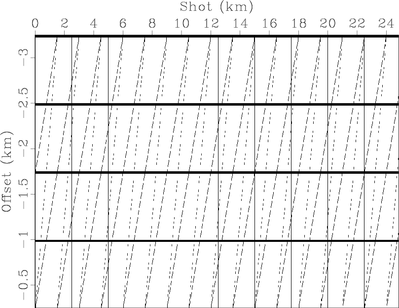 Figure 2. Model of offset-, source-, midpoint-, and receiver-consistent stripes, based on the 2-D amplitude plot in Figure 1. The solid dipping lines correspond to the receiver-consistent stripes, and the dotted lines represent the midpoint-consistent stripes. |