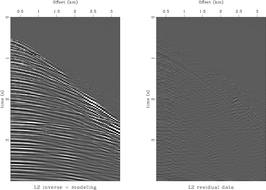 Figure 6. The modeled CMP gather (left) and the residual data (right) plotted at the same scale. |